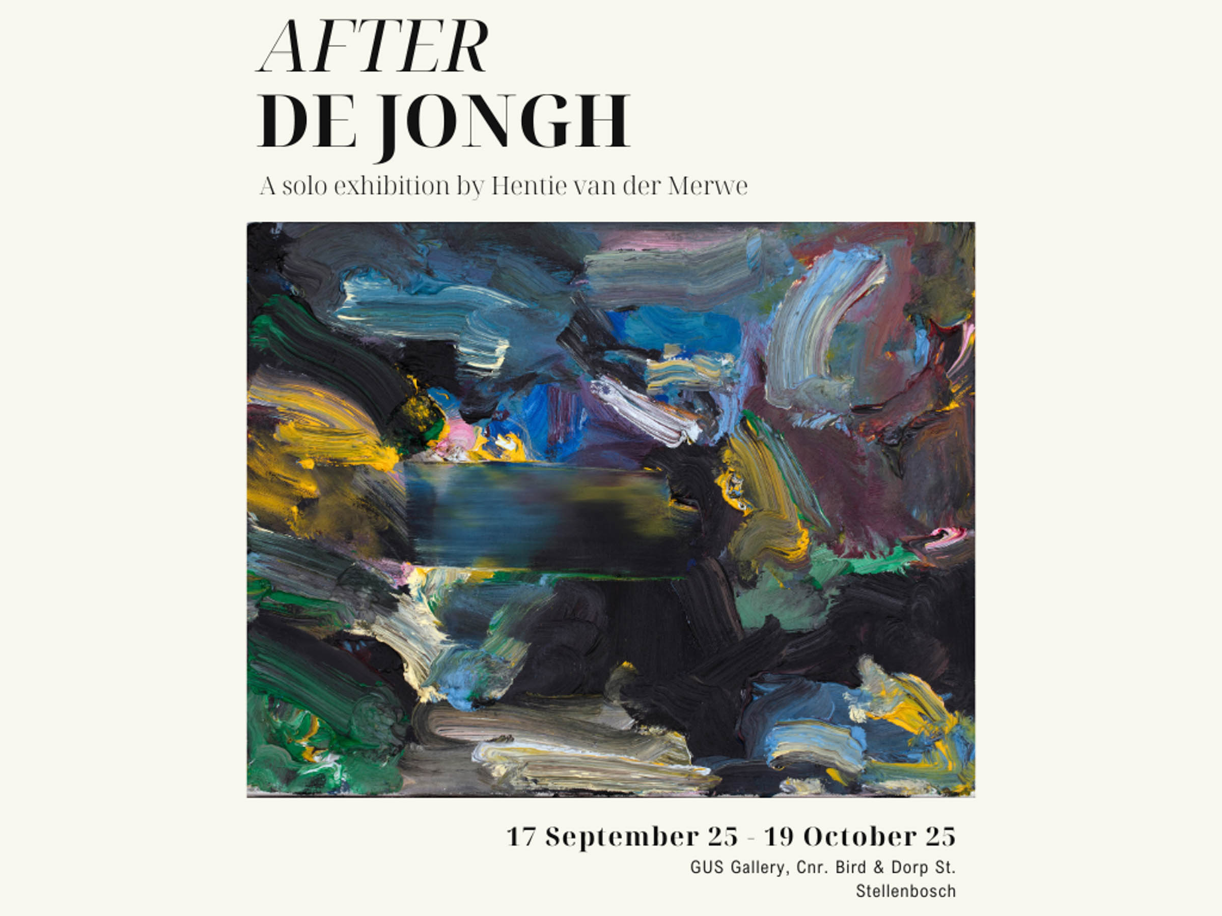 After de Jongh brings together a selection of works that respond to that of Dutch-born South African artist Tinus de Jongh (1885 – 1942) – a defining figure within the landscape painting genre and whose pastoral scenes found particular resonance among Afrikaner audiences throughout the early to mid-20th century. Having intimately experienced the landscapes depicted by de Jongh from childhood, van der Merwe’s abstract paintings emerge as a dialogue where past experience meets present interpretation. Emerging from memory and expressed as visceral response on canvas, the gestural and blurred brushstrokes of richly layered colours suggest movement and depth, amplifying the evocative and affective nature of oil paint. At the same time, in these renditions of traditional visual motifs, van der Merwe confronts pressing culturally significant themes of land ownership and patrimony, as well as dispossession and expropriation within post-Apartheid South Africa.