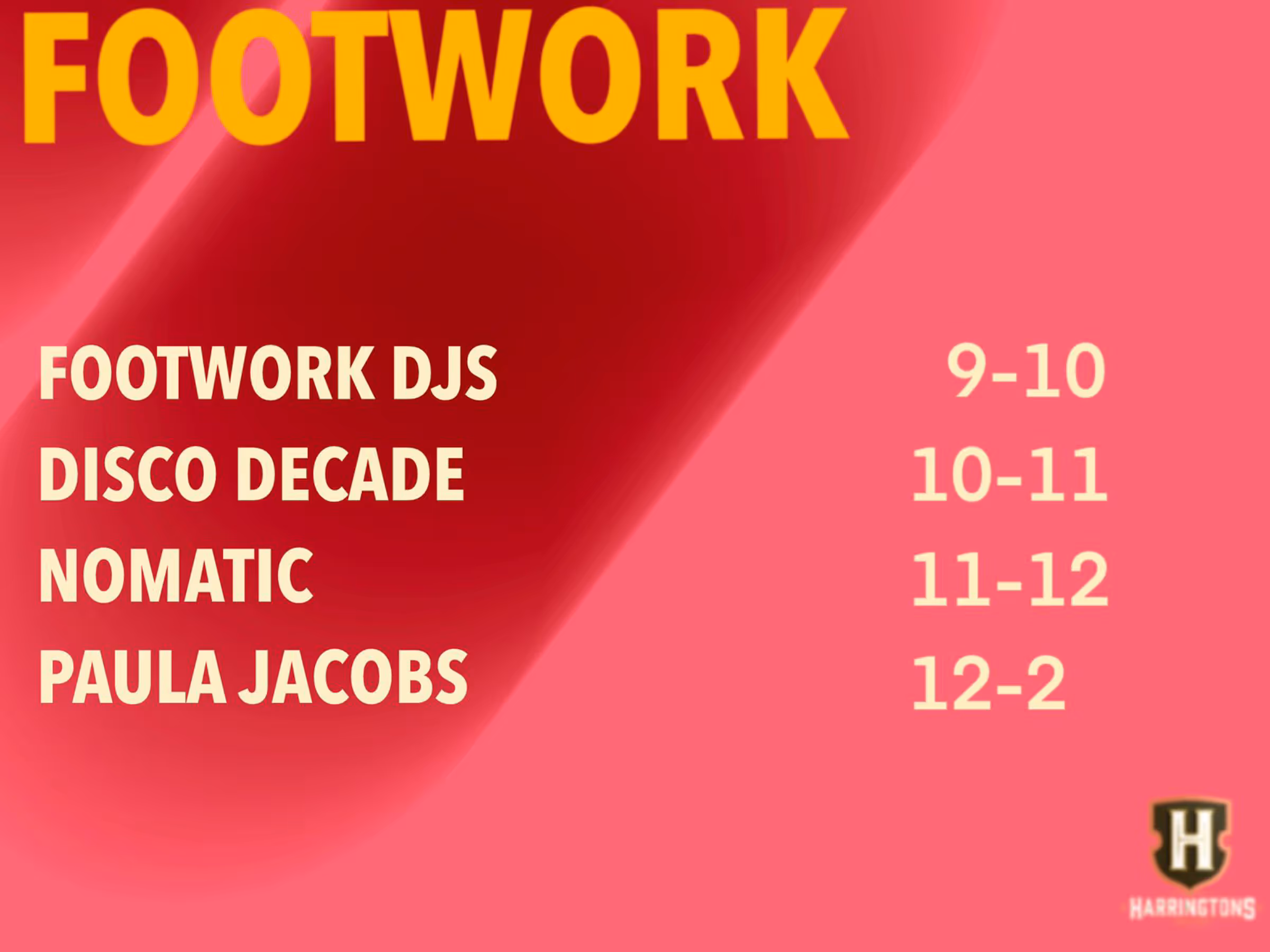 Footwork Thursdays at Harrington's is a monthly night dedicated to disco, groove, and everything in between. Footwork Thursdays brings warm, feel-good energy to the Harringtons dancefloor — no frills, just solid music and a proper midweek vibe.
