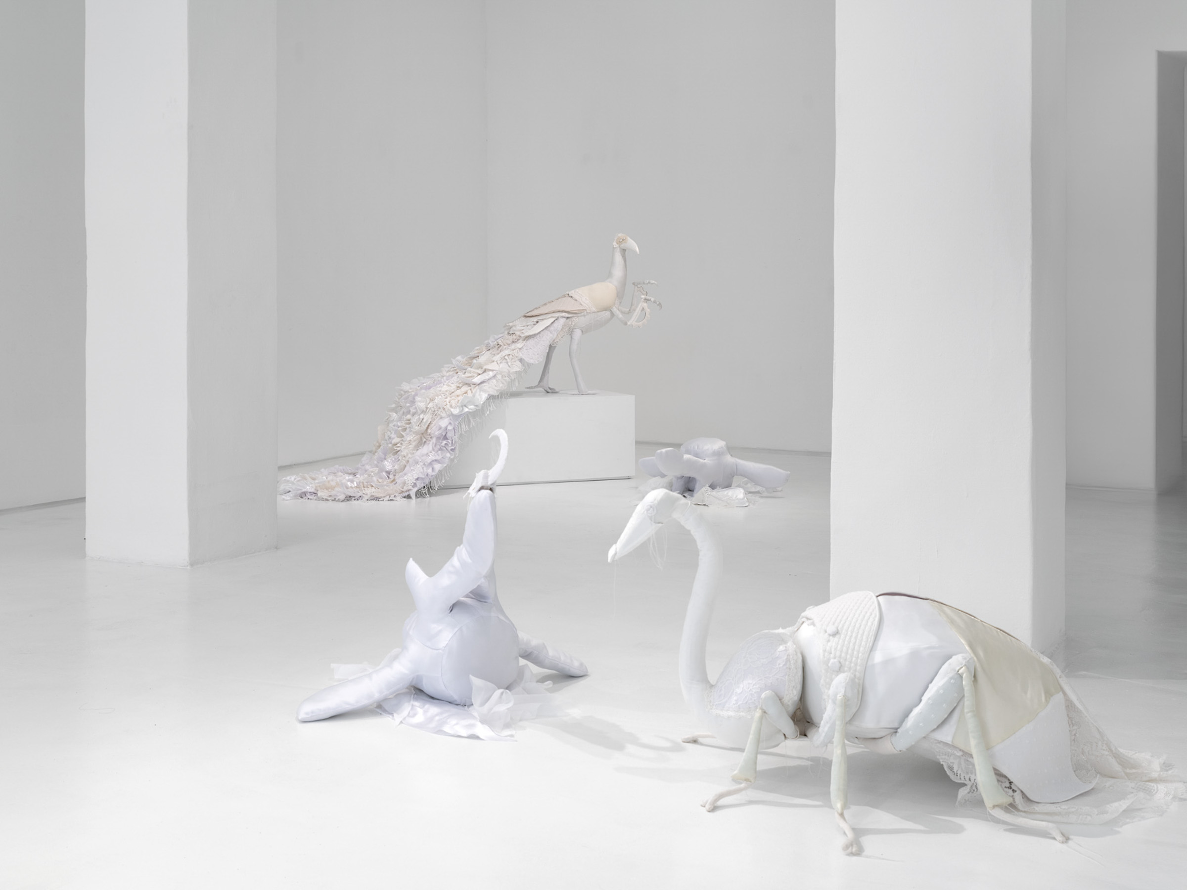 Working with an array of white fabric, lace, linen, cotton, and satin, materials known for their delicacy, Wootton gives form to these abstract horrors - rendering anxiety into something productive and playful. This gentle approach, personified by the fabric, sometimes frayed, always monochrome, seamlessly creates a new kind of species: Creature II is a composite of a two-headed fly with the body of an eagle, while Creature I’s head is a hydraulic grabber and vulture. The peacock, an historical thing of beauty in Creature III, becomes morphed with additional appendages: arms inspired by praying mantis’ and a gear cog from an unknown scrapped machine. These creatures, for all their contradictions, make, as Wootton suggests, “a fatalist future seem less certain.”